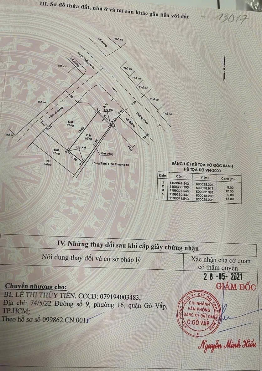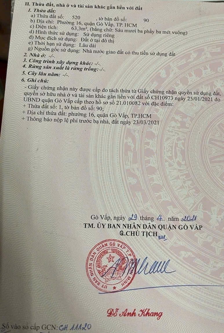 Đất hẻm 440/42A Thống Nhất, Phường 16, Gò Vấp, Hẻm 10m thông, 5x18m, Cn 63,3 m2, 9,2 tỷ TL