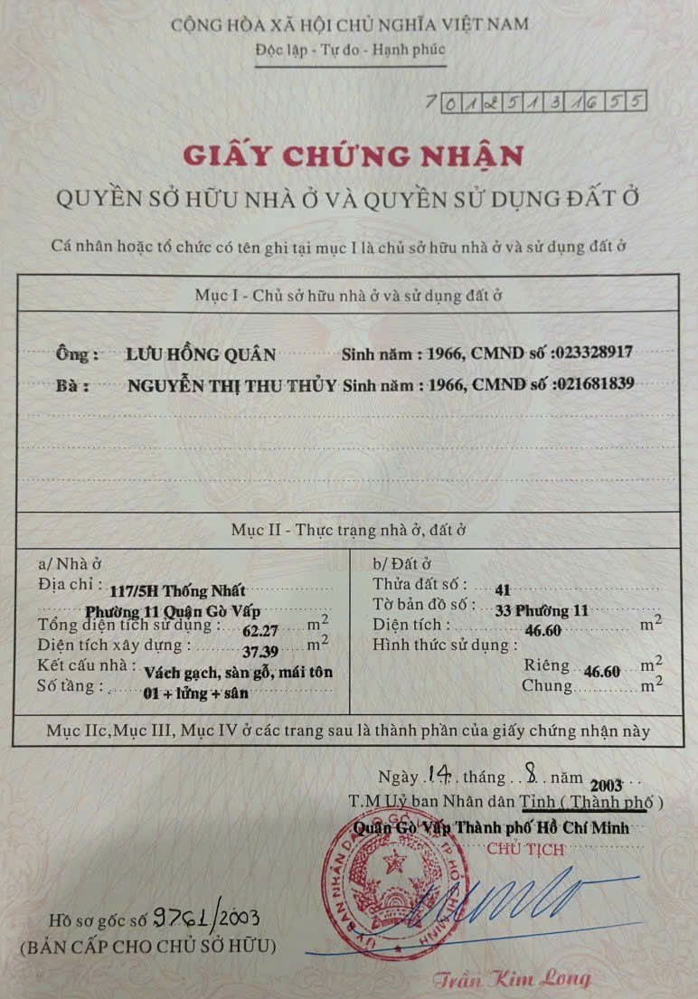 Nhà hẻm 188/10/5 Đường số 8, Phường 11, Gò Vấp, Hẻm 4m, 4x11,8m, Cn 46,6 m2, Cấp 4 lửng, 5,29 tỷ TL Lộc