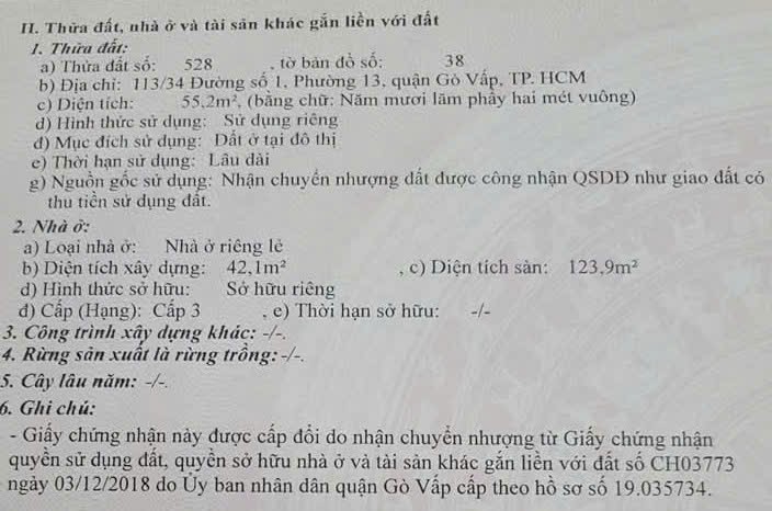 Nhà hẻm 113/34 Đường số 1, Phường 13, Gò Vấp, Hẻm 3,5m, 10x5,5m, Cn 55,2 m2, trệt 2 lầu, ST, 3PN, 3WC, 5,5 tỷ TL