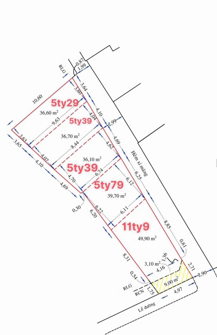 Đất hẻm 134 Lý Thường Kiệt, Phường 7, Gò Vấp, Hẻm 3m, Lô 1: 6,2x6,7m, Cn 39,7 m2, 5,79 tỷ TL. Lô 2: 4,7x8,4m, Cn 36,1 m2, 5,39 tỷ TL. Lô 3: 4,1x9,6m, Cn 36,7 m2, 5,39 tỷ TL. Lô 4: 3,65x10,6m, Cn 36,6 m2, 5,29 tỷ TL