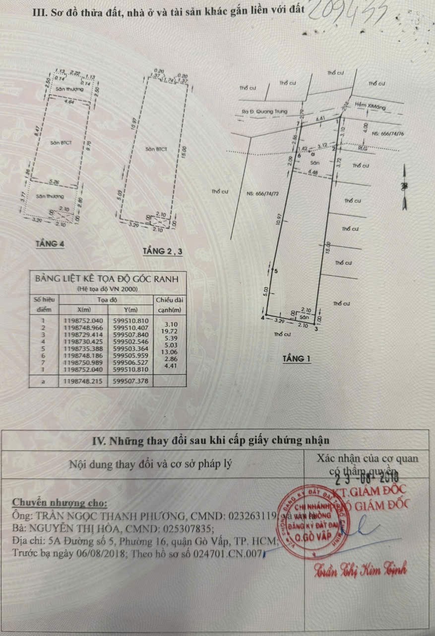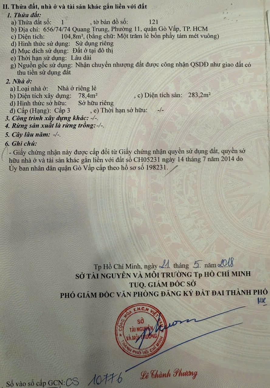 Bán Chdv hẻm 656/74/74 Quang Trung, Phường 11, Gò Vấp, Hẻm 3m thông, 4,4 NH 5,4x23m, Cn 104,8 m2, trệt 3 lầu, ST, 10PN có lửng, 10WC, 9,35 tỷ TL