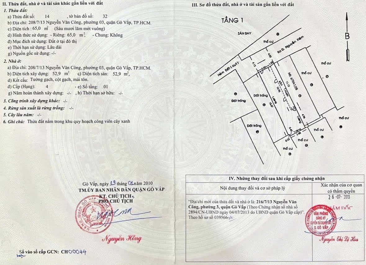Nhà hẻm 216/7/13 Nguyễn Văn Công, Phường 3, Gò Vấp, Hẻm 4m, 4x16,5m, Cn 65 m2, trệt 1 lầu, 2PN, 2WC, 6,85 tỷ TL Lộc