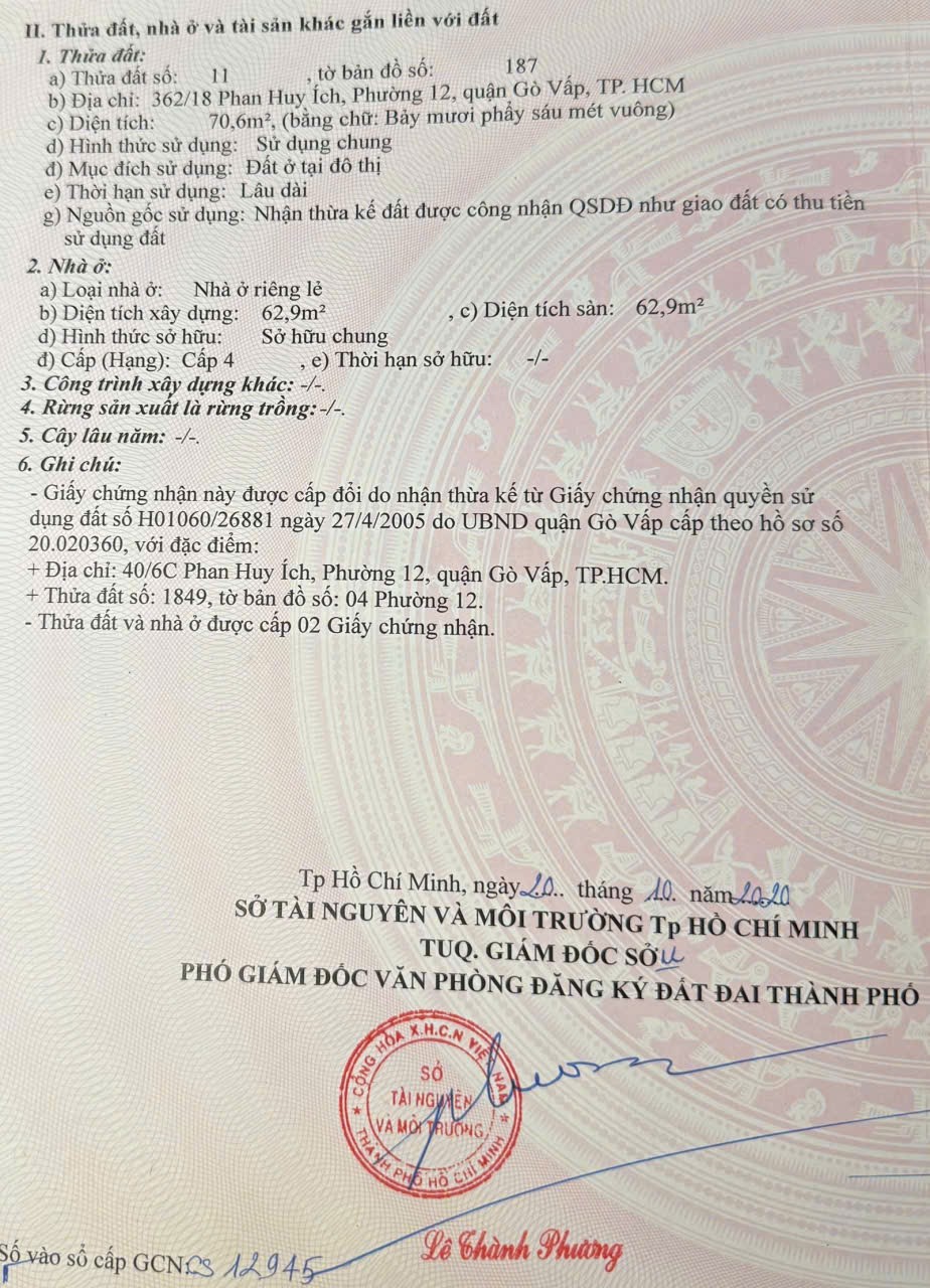 Nhà 2 MT hẻm 362/18 Phan Huy Ích, Phường 12, Gò Vấp, Hẻm 6m thông, 3,45x21m, Cn 70,6 m2, Cấp 4, 2PT, 1MB, 5,26 tỷ TL