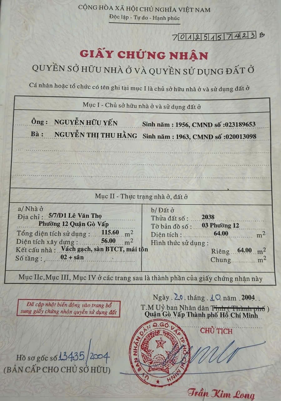 Nhà hẻm 549/71/2 Lê Văn Thọ, Phường 14, Gò Vấp, Hẻm 6m thông, 4x16m, Cn 64m2, trệt 1 lầu, 2PN, 2WC, 7,56 tỷ TL