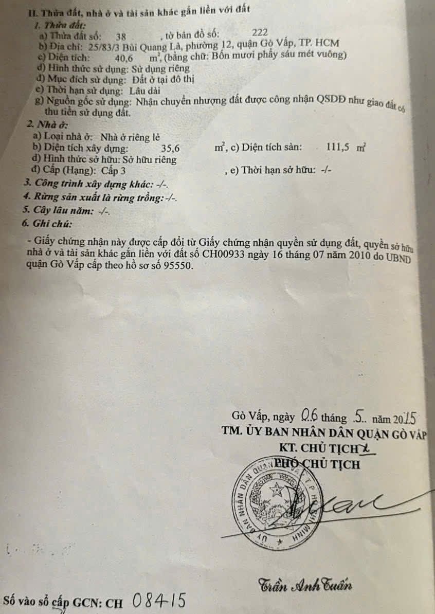 Nhà hẻm 25/83/3 Bùi Quang Là, Phường 12, Gò Vấp, Hẻm 4m, 3,3x12,5m, Cn 40,6 m2, trệt 2 lầu, 4PN, 3WC, Nội thất, 5,45 tỷ TL
