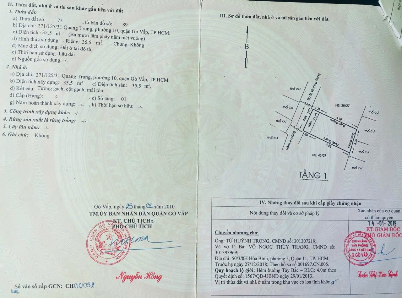 Nhà hẻm 275/133/23B Quang Trung, Phường 10, Gò Vấp, Hẻm 3m, 4,08 NH 4,25x8,5m, Cn 35,5 m2, trệt 1 lầu, 2PN, 2WC, Full nội thất, 4,55 tỷ TL Lộc