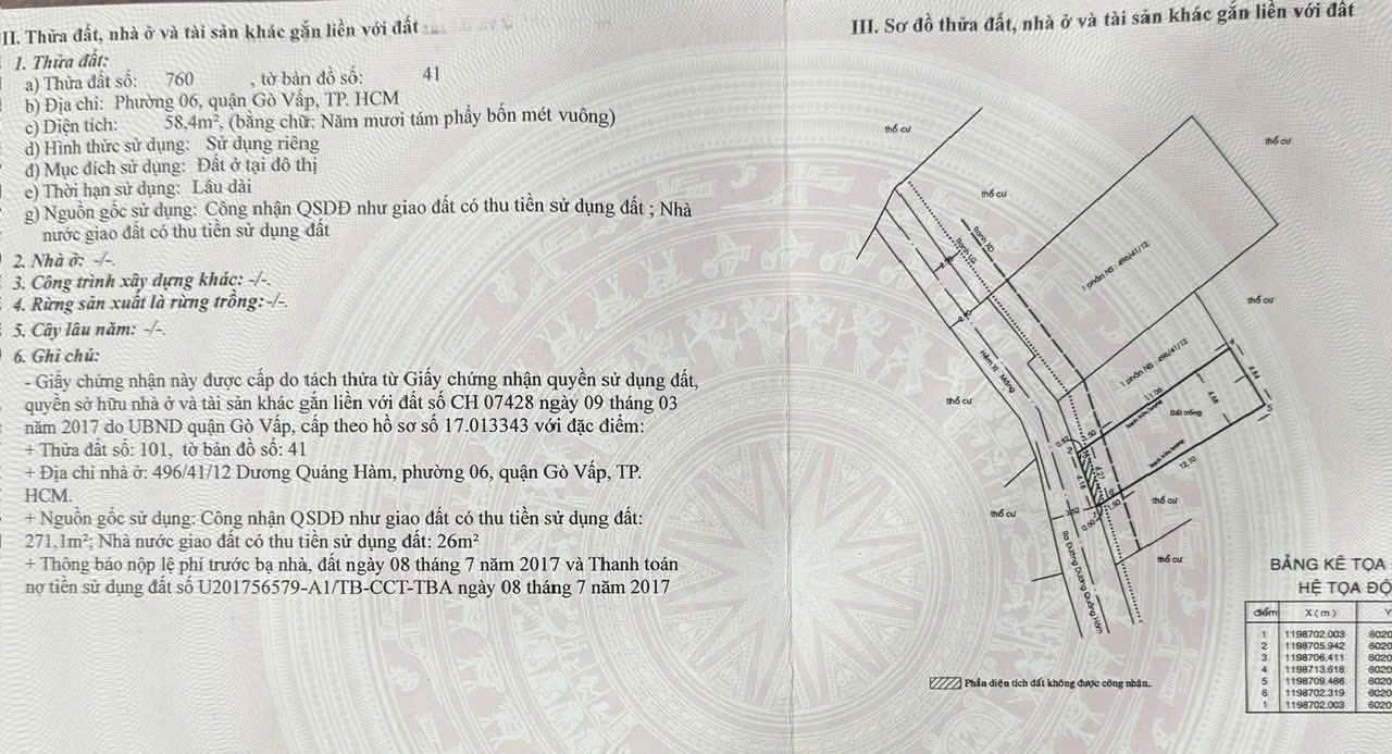 Đất hẻm 496/41/12 Dương Quảng Hàm, Phường 6, Gò Vấp, Hẻm 4m, 4,2 NH 4,8x13,5m, Cn 58,4 m2, 6,7 tỷ TL