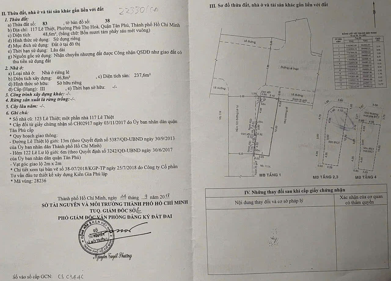 Nhà 2 MT 117 Lê Thiệt, Phường Phú Thọ Hòa, Tân Phú, MT 15m, 4x12,5m, Cn 48,6 m2, trệt 3 lầu, ST, 4PN, 4WC, 10,8 tỷ TL
