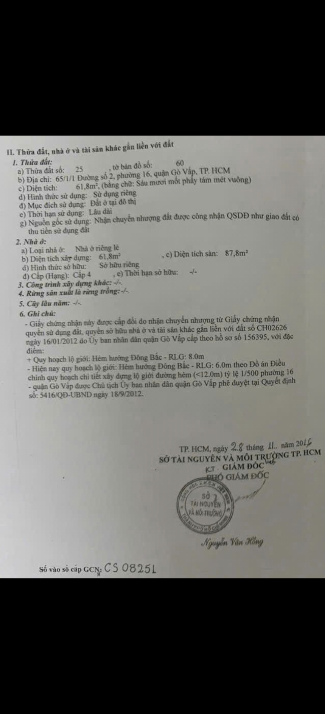 Nhà hẻm 65/1/1 Đường số 2, Phường 16, Gò Vấp, Hẻm 3m, 4x15,5m, Cn 61,8 m2, Cấp 4 lửng, 3PN, 2WC, Full nội thất, 5,8 tỷ TL