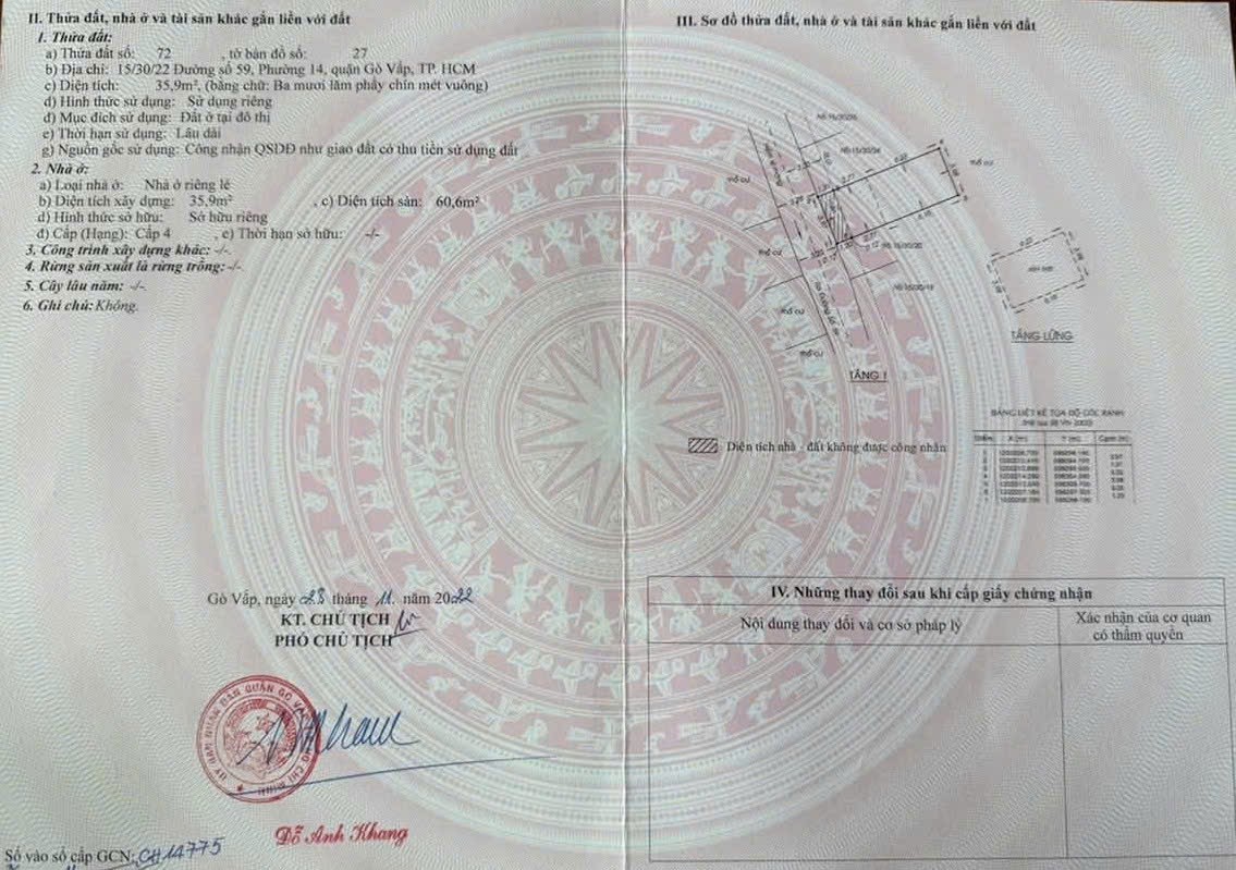 Nhà hẻm 15/30/22 Đường số 59, Phường 14, Gò Vấp, Hẻm 3,2m, 4x10m, Cn 35,9 m2, Cấp 4, 4,5 tỷ TL