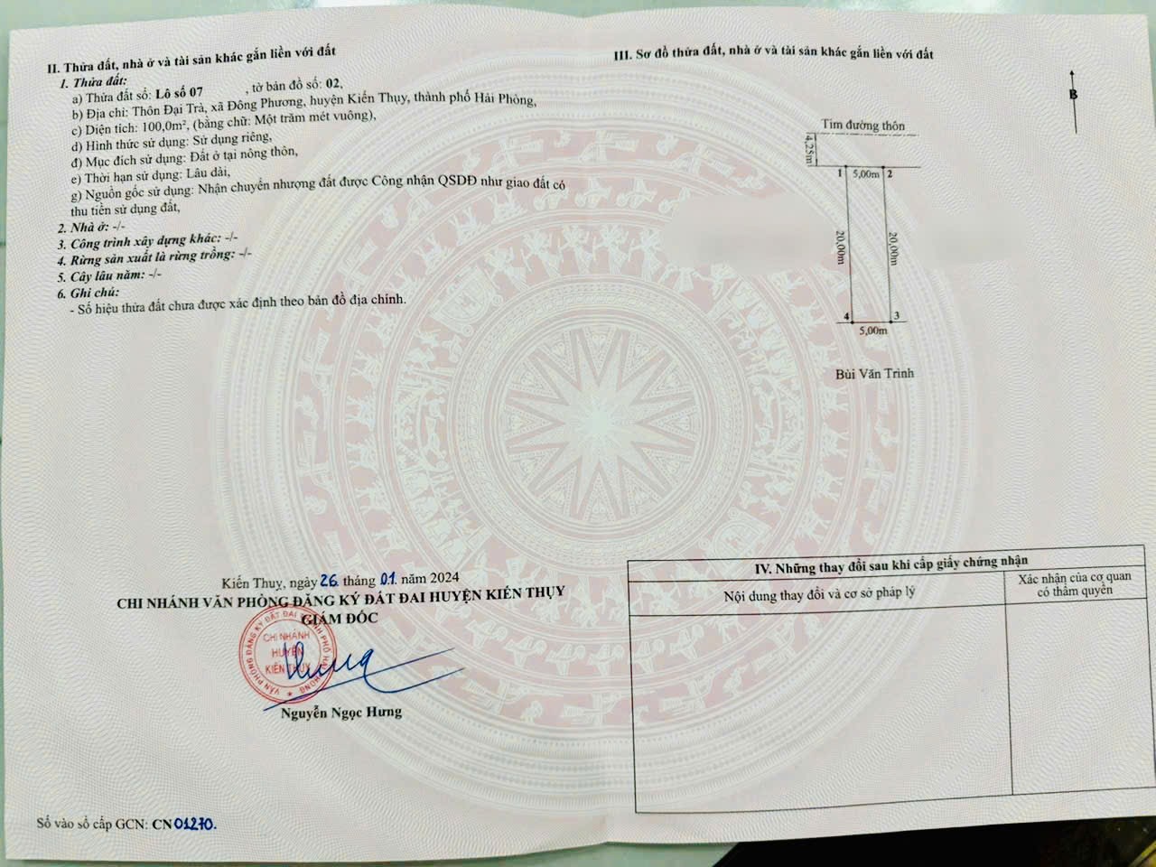 - Pháp lý: Giấy chứng nhận QSDĐ cấp năm 2024, mục đích sử dụng đất ở tại nông thôn, thời hạn sử dụng lâu dài.