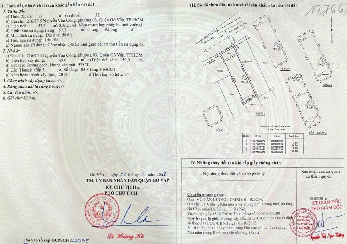Nhà hẻm 216/7/15 Nguyễn Văn Công, Phường 3, Gò Vấp, Hẻm 6m, 3,85x15m, Cn 57,3 m2, trệt lửng 3 lầu, ST, 5PN, 4WC, 1PT, 7,5 tỷ TL