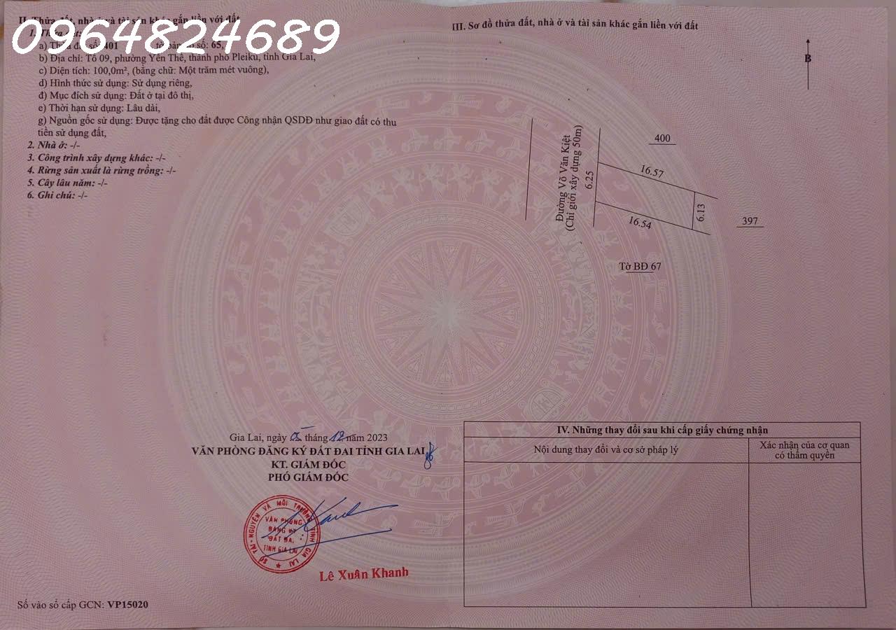 Bán lô đất siêu đẹp tại đường Võ Văn Kiệt, phường Thống Nhất, TP.Plei Ku, DT 842m2, giá đầu tư