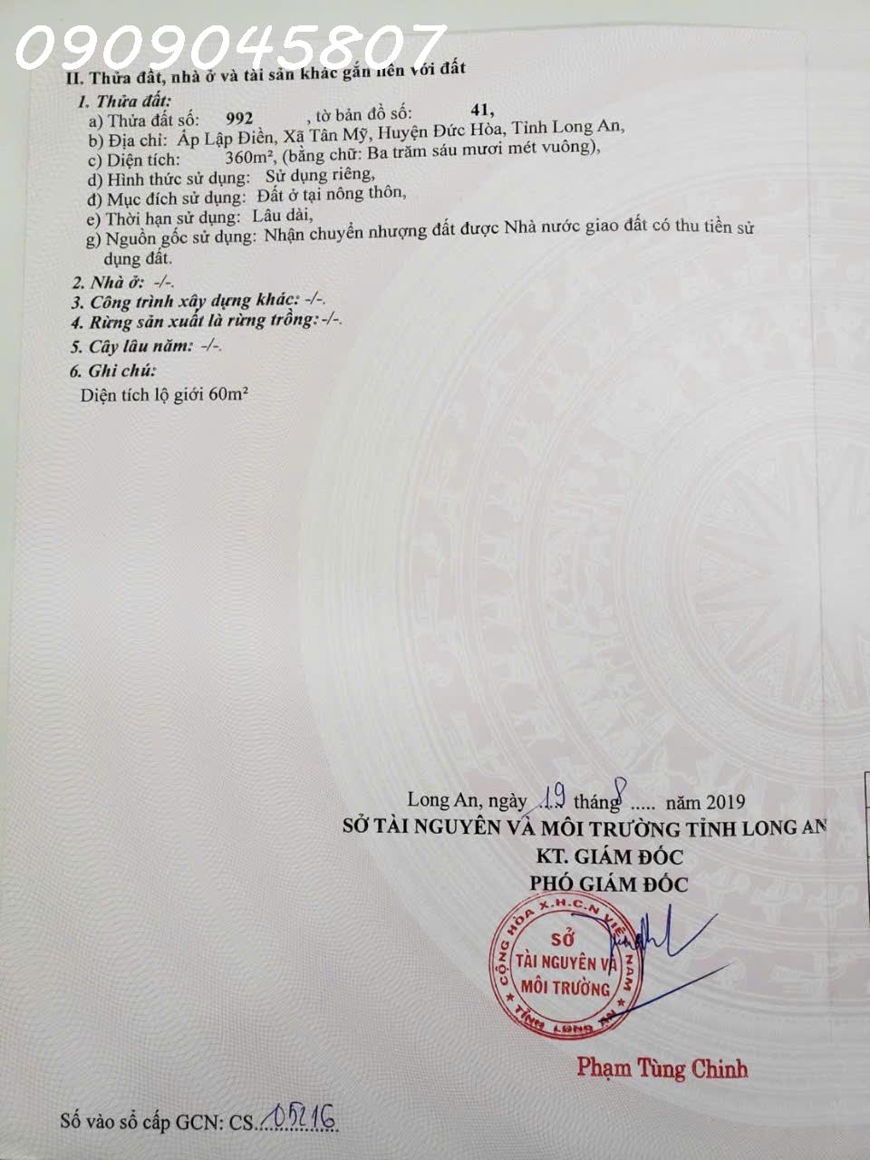 Chính chủ bán gấp 360m2 đất thổ cư 100% Đức Hòa giá 1,55 tỷ có phí hh cho môi giới - LH 0909 045 807