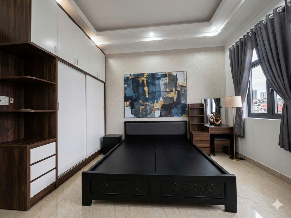 - Có 1 phòng thờ, 4 phòng ngủ, có nhiều cửa sổ thoáng sáng, có ban công trước để ngồi đọc sách, tập thế dục, hít thở không khí trong lành.